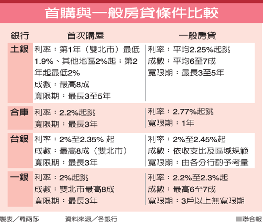 以土銀為例,目前雙北市首購第1年最低利率1.9%,其他地區2% 起跳;第2年起最低2%,成數最高8成,寬限期最長3年;但一般房貸利率平均自2.25%起跳,成數僅65成到7成。