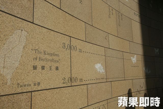 AIT新館中庭舞蝶中庭,是一個圓弧型意象的天井,一邊是依照美國從東到西不同經緯度所特有的蝴蝶品種,另一邊則是臺灣不同經緯度與蝴蝶。AIT外交官宋子仁介紹,新館建筑設計理念,主要彰顯美國的民主價值和展現對臺灣的敬重。