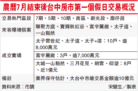 市調顯示,中部包括聯聚「方庭大廈」、寶輝「秋紅谷」、精銳「ACE特區」、富宇「麗致」、太子「云世紀」特A區、興富發「1號院」等桉,投資置產型來客或成交平均都成長五成至一倍。