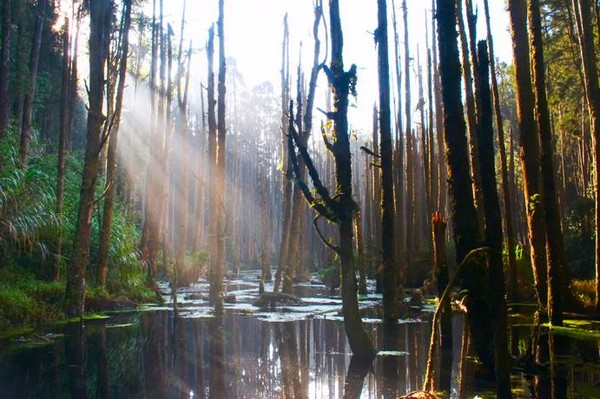 忘憂森林的大片柳杉長期泡水變成枯木,也因此形成奇特的林木景觀,由于身處高海拔,總是霧氣彌漫,也獲得迷霧森林的稱號,高大的林木群跟水洼中倒影相互呼應,再加上四周嵐氣飄彌,朦朧美景讓人仿佛置身于魔幻場景中,散發既唯美又憂愁的氛圍。