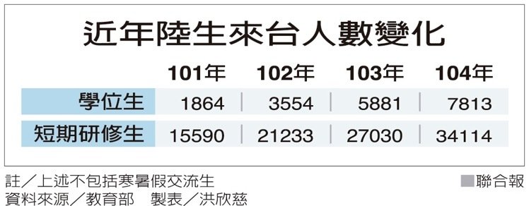 教育部統(tǒng)計(jì),去年四萬(wàn)多名陸生在臺(tái)求學(xué),其中三萬(wàn)四千多人是短期生。不少私校指出,陸生若減少,除了影響交流機(jī)會(huì),也會(huì)沖擊學(xué)校財(cái)務(wù)。