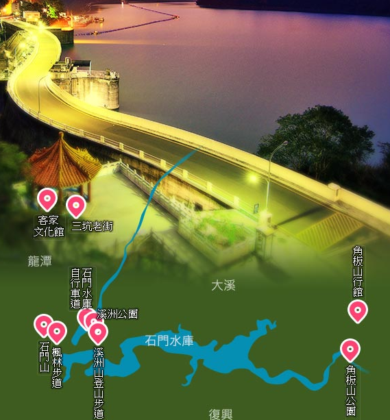 石門水庫是遠東最大的水庫,一年四季,湖光山色,風景秀麗。石門水庫對外可連接十幾個旅游景點,園區(qū)大小公園綠樹成林,有自行車步道,也有環(huán)湖游艇,提供旅客多元的休閑樂趣。園區(qū)內受游客青睞的游覽景點包括大壩、溢洪道、游湖碼頭、溪洲公園、槭林公園、南苑生態(tài)園區(qū)等。 石門水庫也是賞花的好去處。冬季時節(jié),放眼望去,楓葉一片金黃;梅花雪白花海,令人目不暇給。春天來臨之時,更有桃花、櫻花、杜鵑爭妍斗艷。每逢雨季,大壩泄洪時,場面壯觀,總吸引許多游客前來游賞。石門水庫還設有石門大壩碼頭及阿姆坪碼頭,旅客可搭乘游艇環(huán)湖,在湖面上飽覽壯麗的水庫風光。 石門活魚是這里最著名美食,每家餐廳各有不同的招牌,吃法高達近200種。